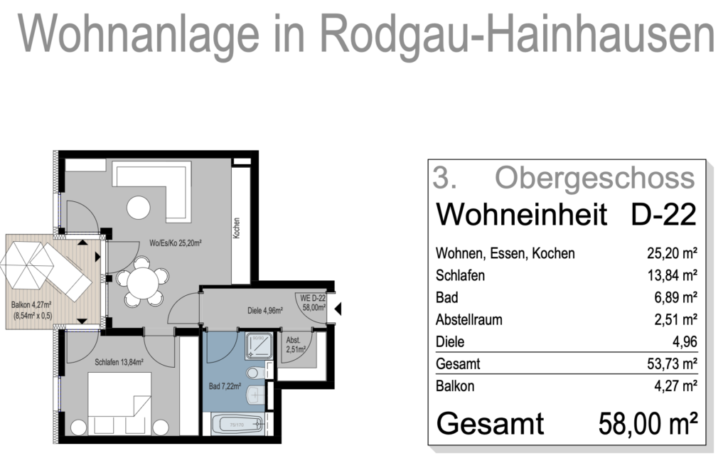 Die Wohneinheit D-22 im Staffelgeschoss verfügt über eine Gesamtfläche von 58,00 m². Der offene Bereich für Wohnen, Essen und Kochen umfasst 25,20 m². Zusätzlich steht ein Balkon mit einer Fläche von 4,27 m² (anteilig 50%) zur Verfügung, der das Wohnambiente erweitert. Weitere Räume wie ein Abstellraum mit 2,51 m² sind ebenfalls Teil der Wohnung, was eine funktionale und komfortable Nutzung des Raumes ermöglicht.